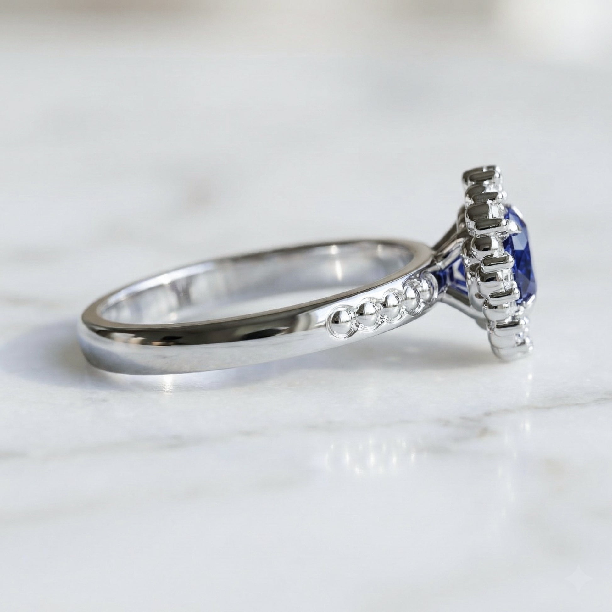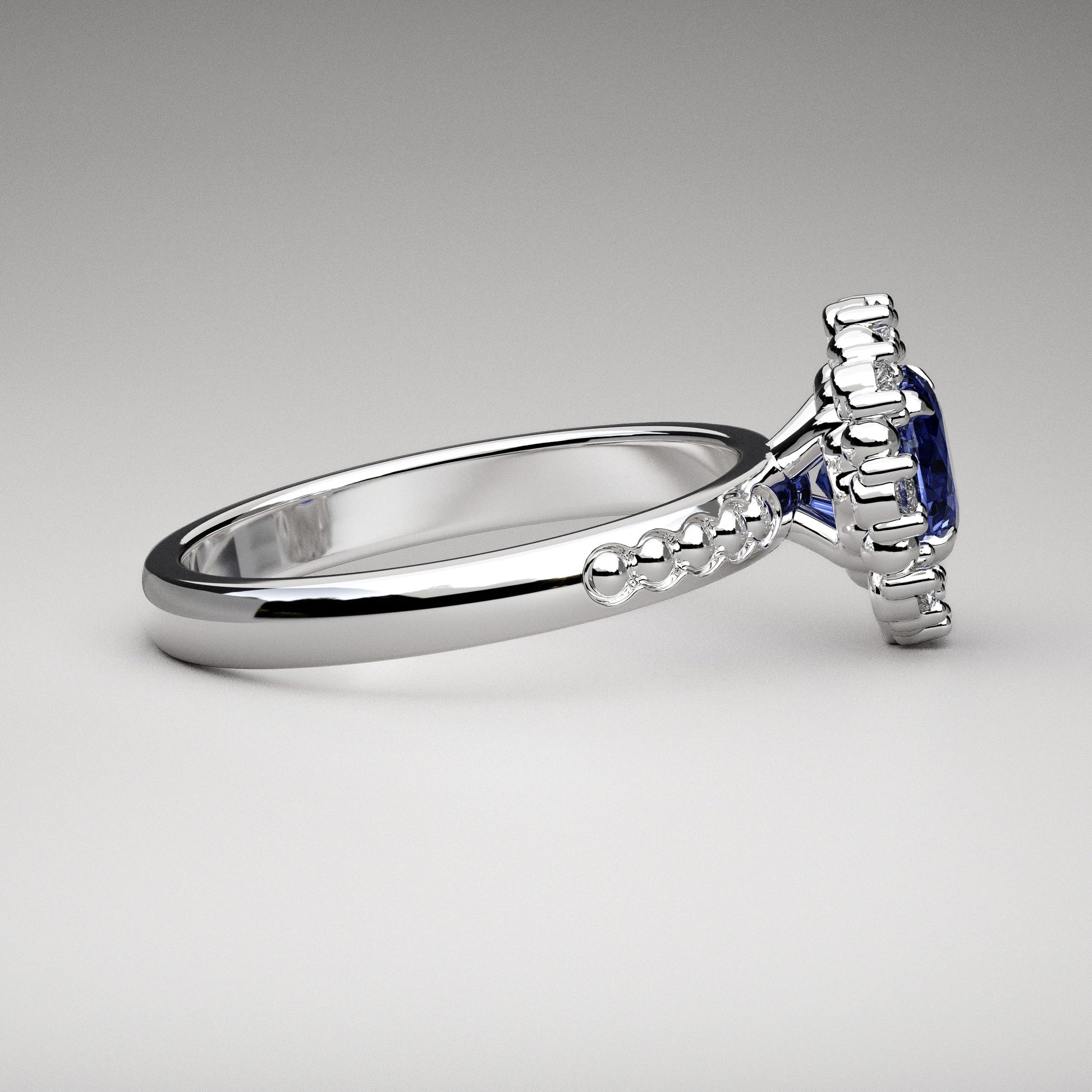 A medium blue round Chatham sapphire is surrounded by a halo of round gold beads alternating with lab grown diamonds in this unique engagement ring. Lab grown gems are inherently conflict-free and environmentally friendly, and Chatham (est. 1938) is the premier name in lab grown gemstones. All of their gems possess the same physical, optical and chemical structure as their mined counterpart, and just like a pristine natural gemstone, Chatham sapphires are not irradiated or heat treated or coated - the color exists throughout.