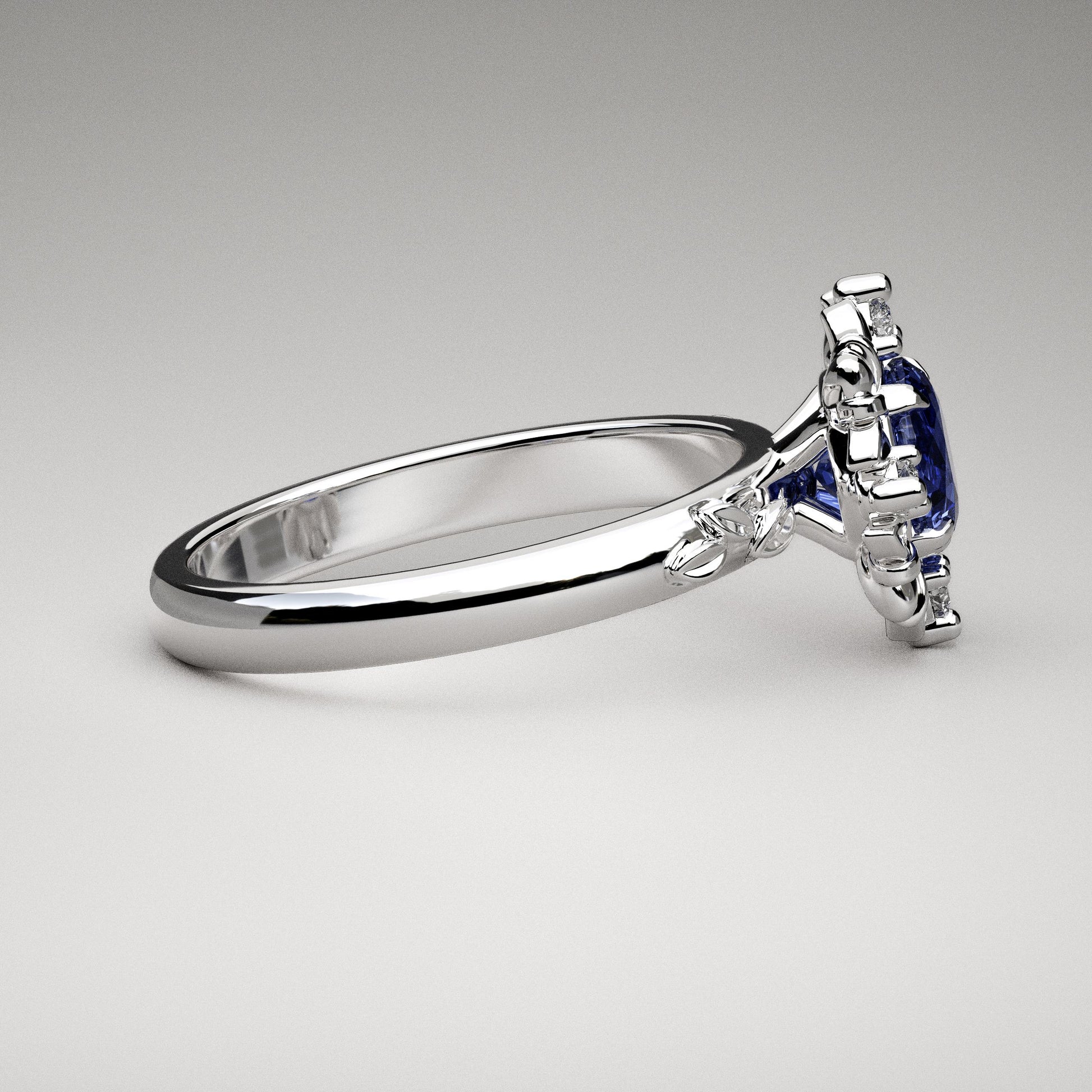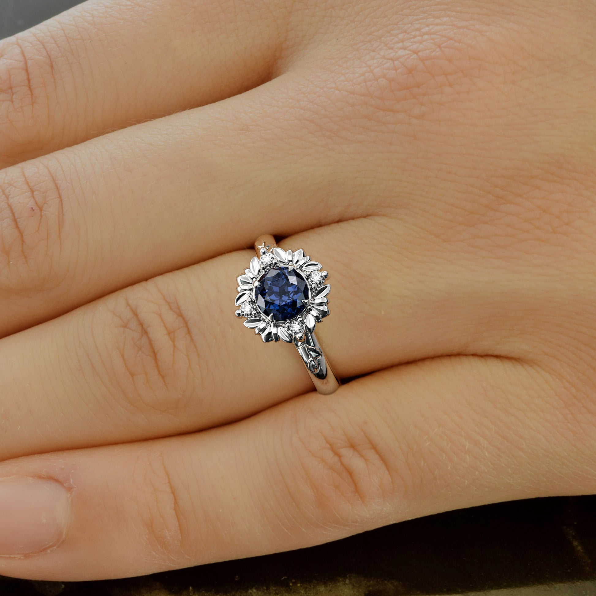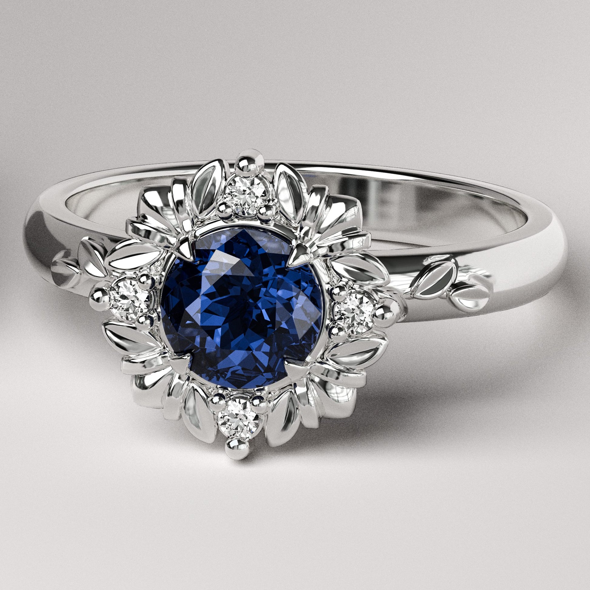 Lab grown round blue sapphire engagement ring. This unique ring, inspired by classic antique design elements, has a carved gold and lab grown diamond halo surrounding a 1.1 carat medium blue lab grown sapphire. This ring was inspired by carvings of the Romantic and Baroque Eras, making it a modern take on classic design.