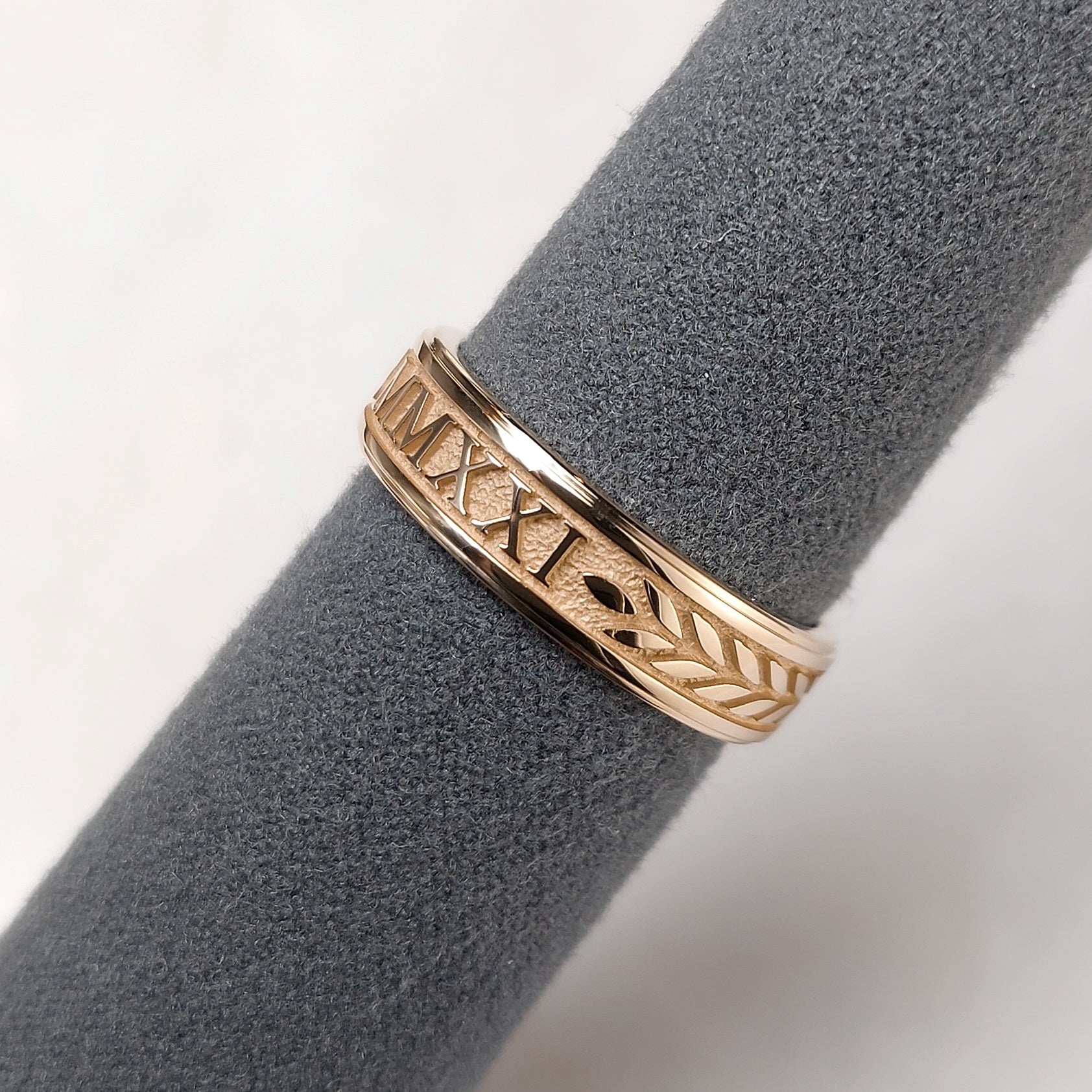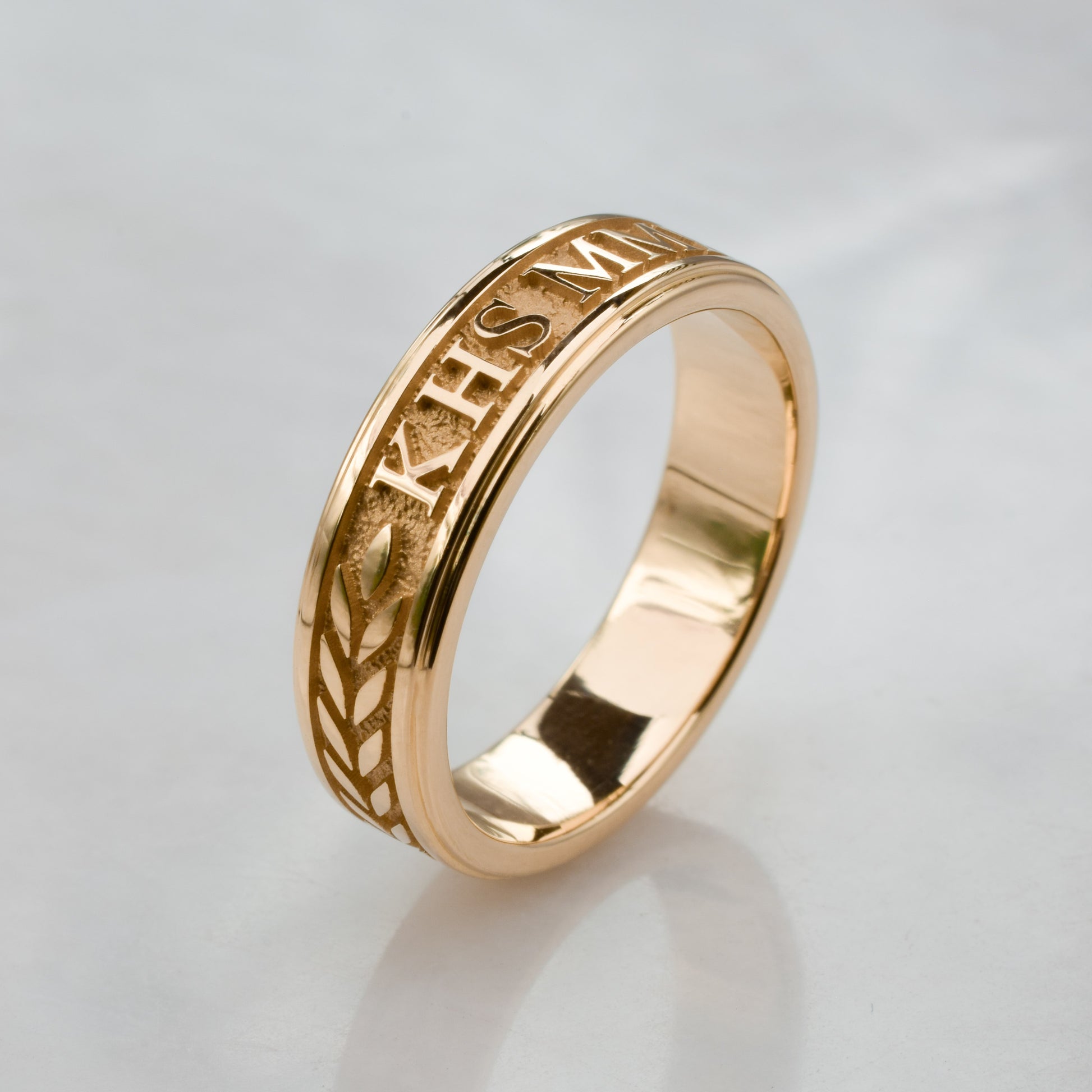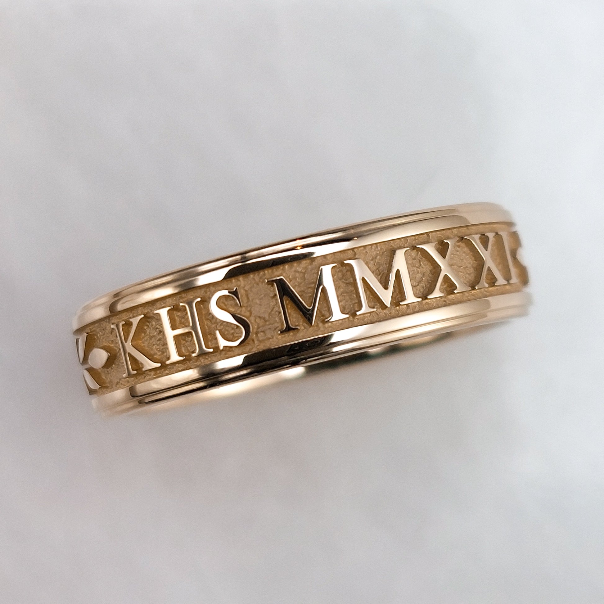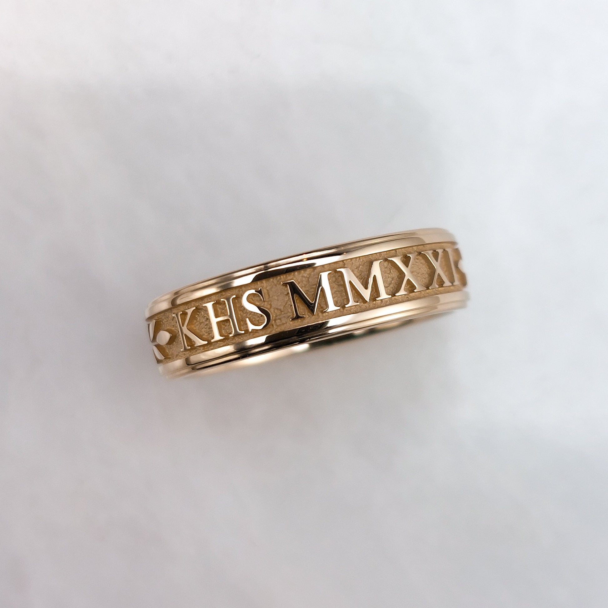 This is a class ring in solid 10K or 14K rose gold. Your graduating year in Roman Numerals( can be in standard digits if you prefer) and school letters are cast right into a solid rose gold ring. For those who would prefer a band style ring to commemorate their graduation.