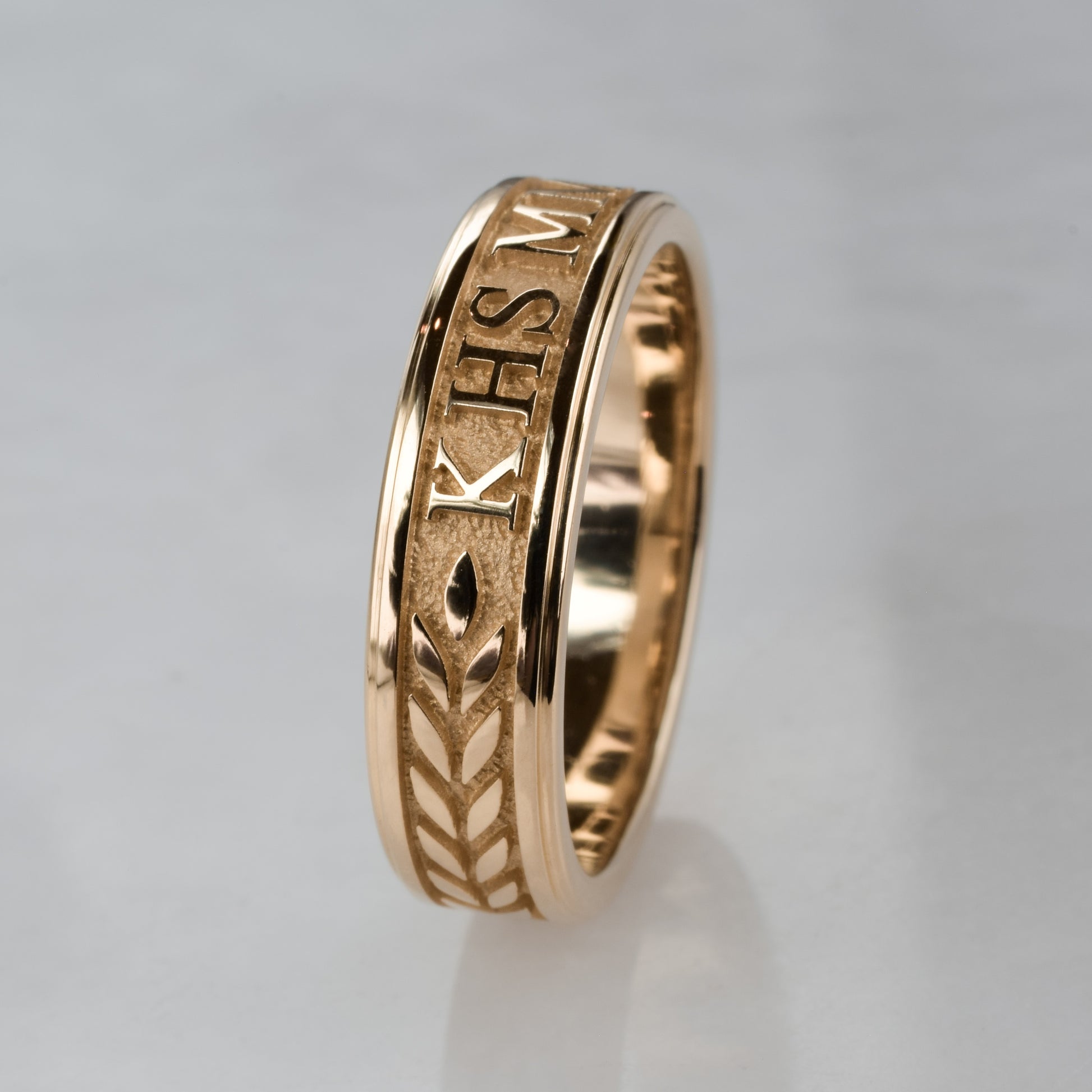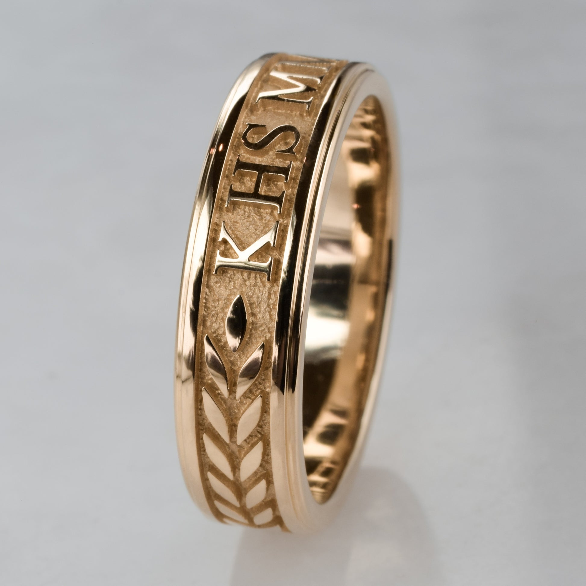 - Background to the characters is highly textured and has a sandblasted finish. The rest of the ring is highly polished
