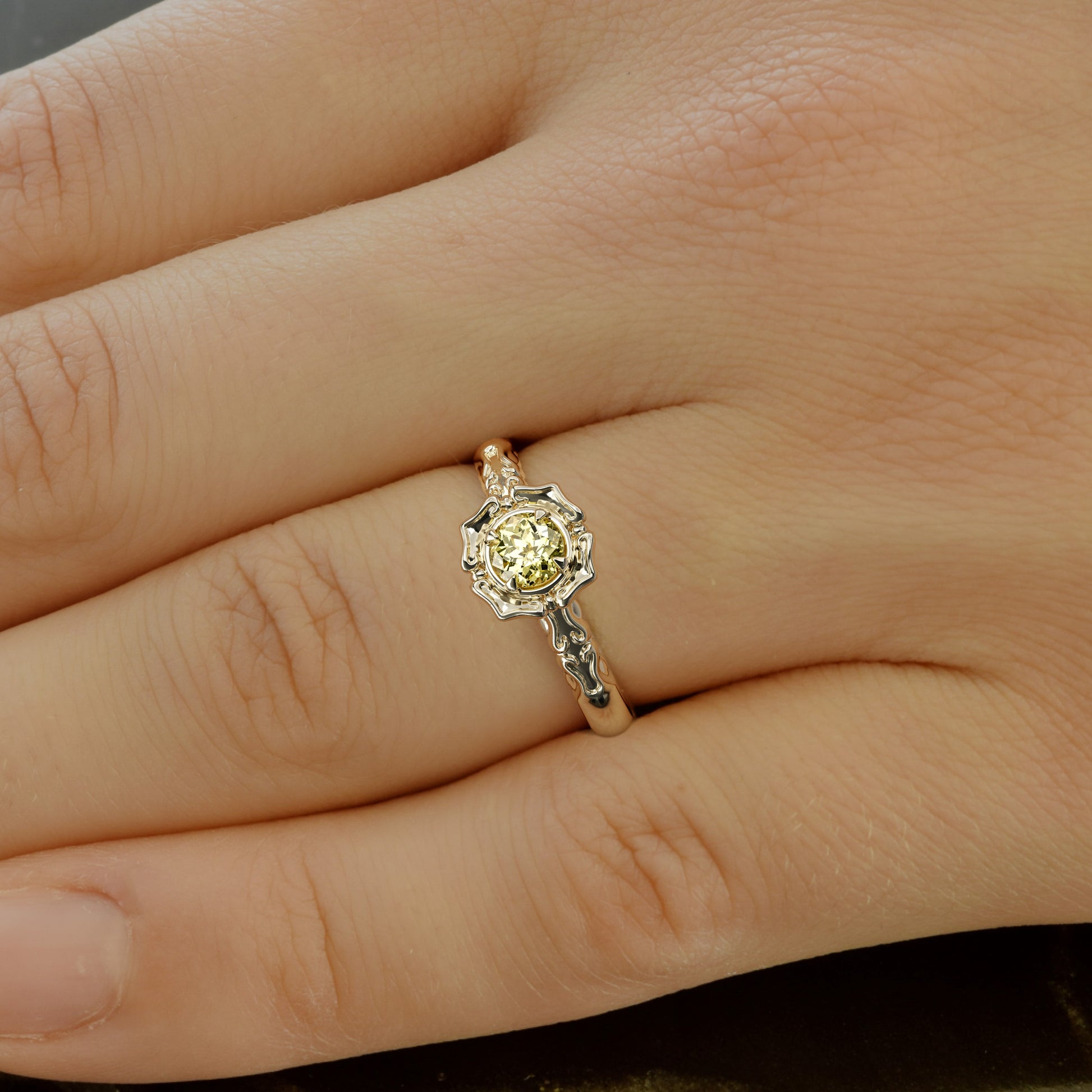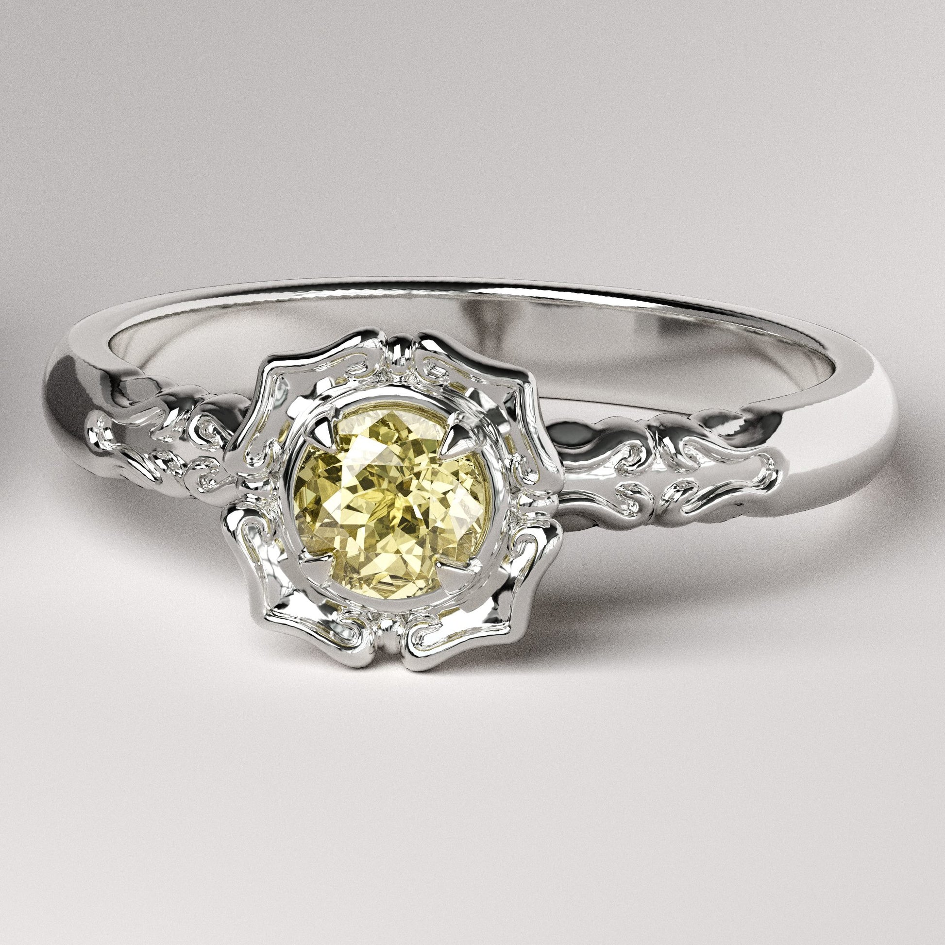 A lab created light yellow sapphire and stylized flower petals are featured in this antique style unique engagement ring. Details on the underside of the setting and on the shank compliment the setting. Chatham is the premier name in lab created gemstones and all of their gems possess the same physical, optical and chemical structure as their mined counterpart. And just like a pristine natural gemstone, Chatham sapphires are not irradiated or heat treated or coated - the color exists throughout.