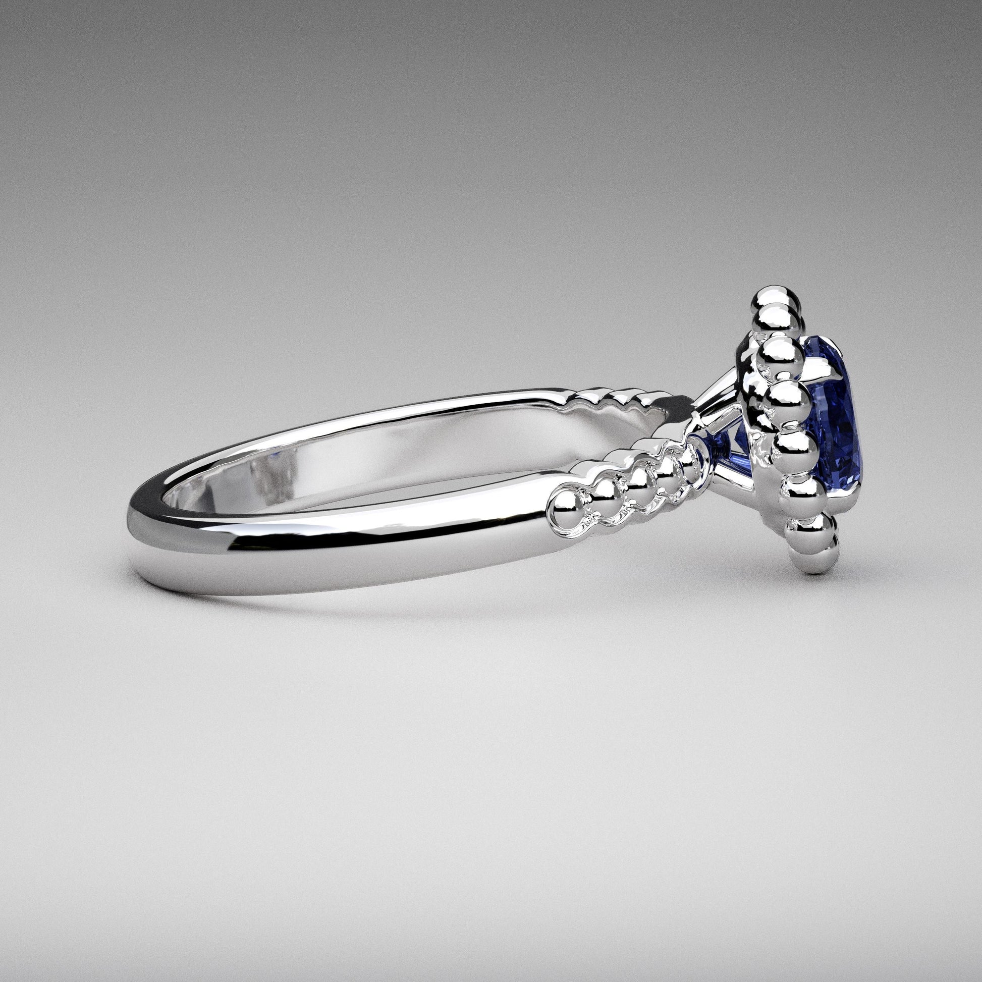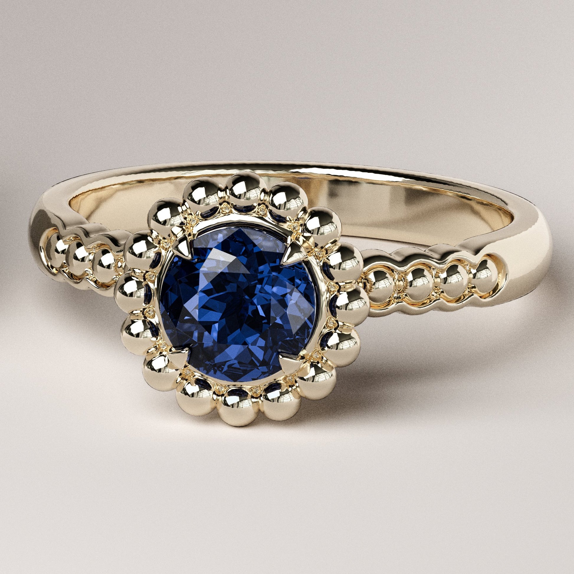 Lab grown, round medium blue sapphire ring. A halo of gold spheres surround the center gem in this artisan made ring. The halo is almost like a little necklace of gold beads and gives the ring a vintage feel. This engagement ring will fit closely next to many available wedding bands(setting will sit above the band).