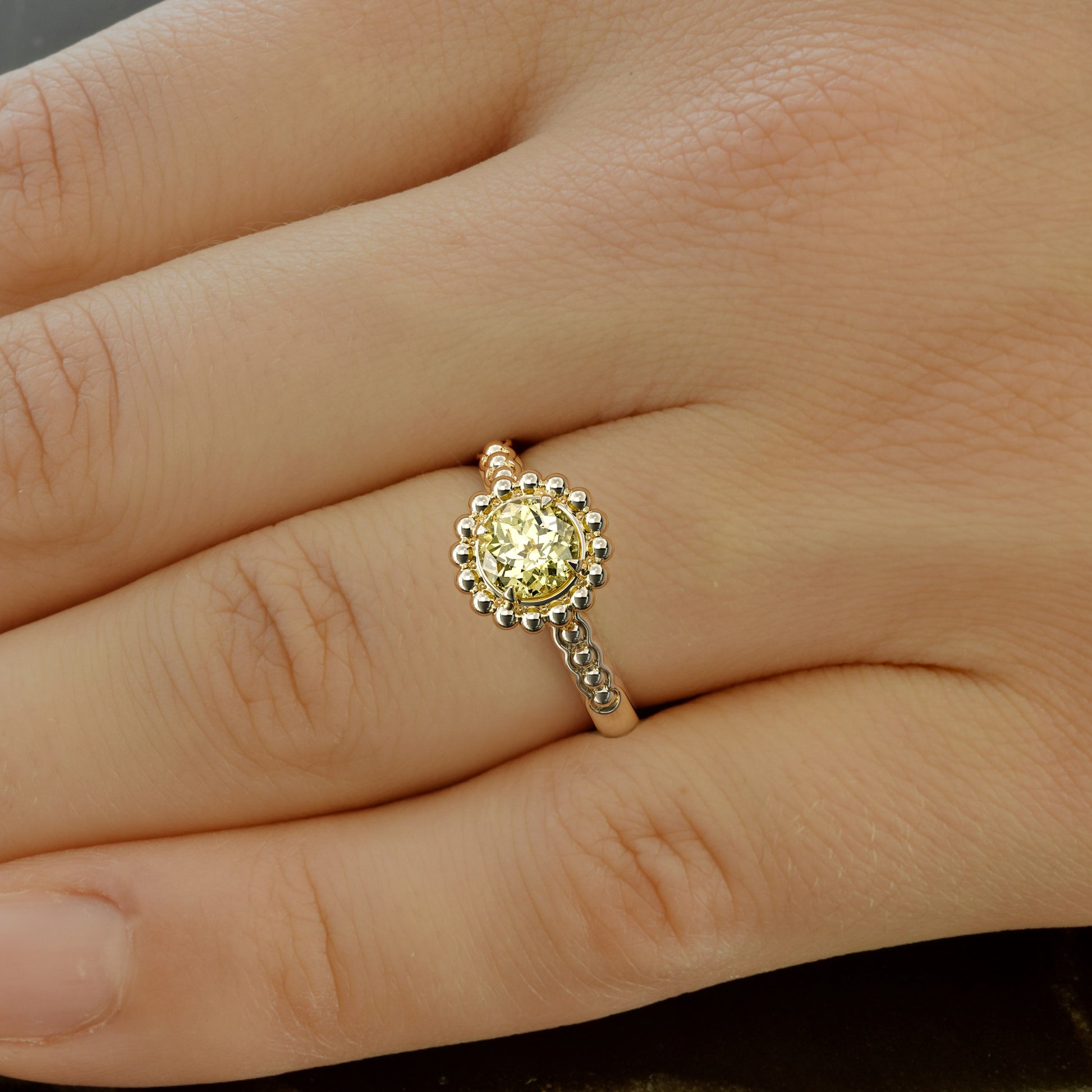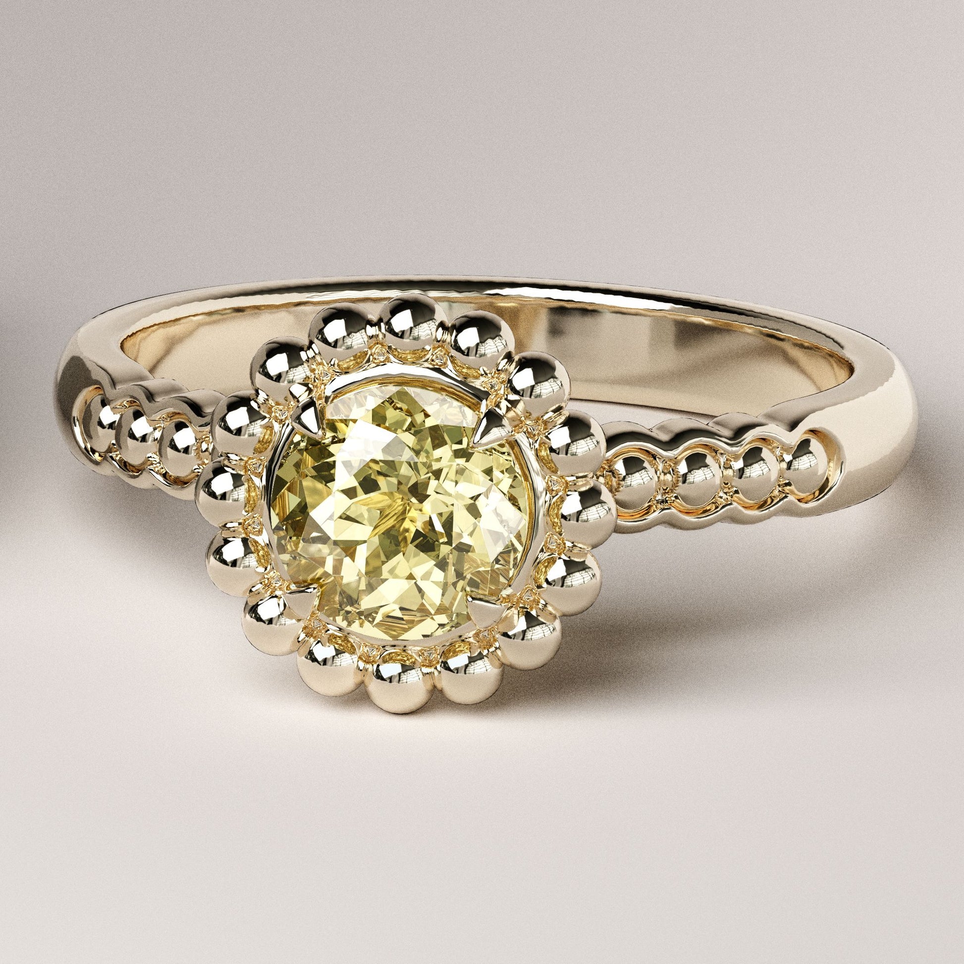 Lab grown, round light yellow sapphire ring. A halo of gold spheres surround the center gem in this artisan made ring. The halo is almost like a little necklace of gold beads and gives the ring a vintage feel. This engagement ring will fit closely next to many available wedding bands(setting will sit above the band).
