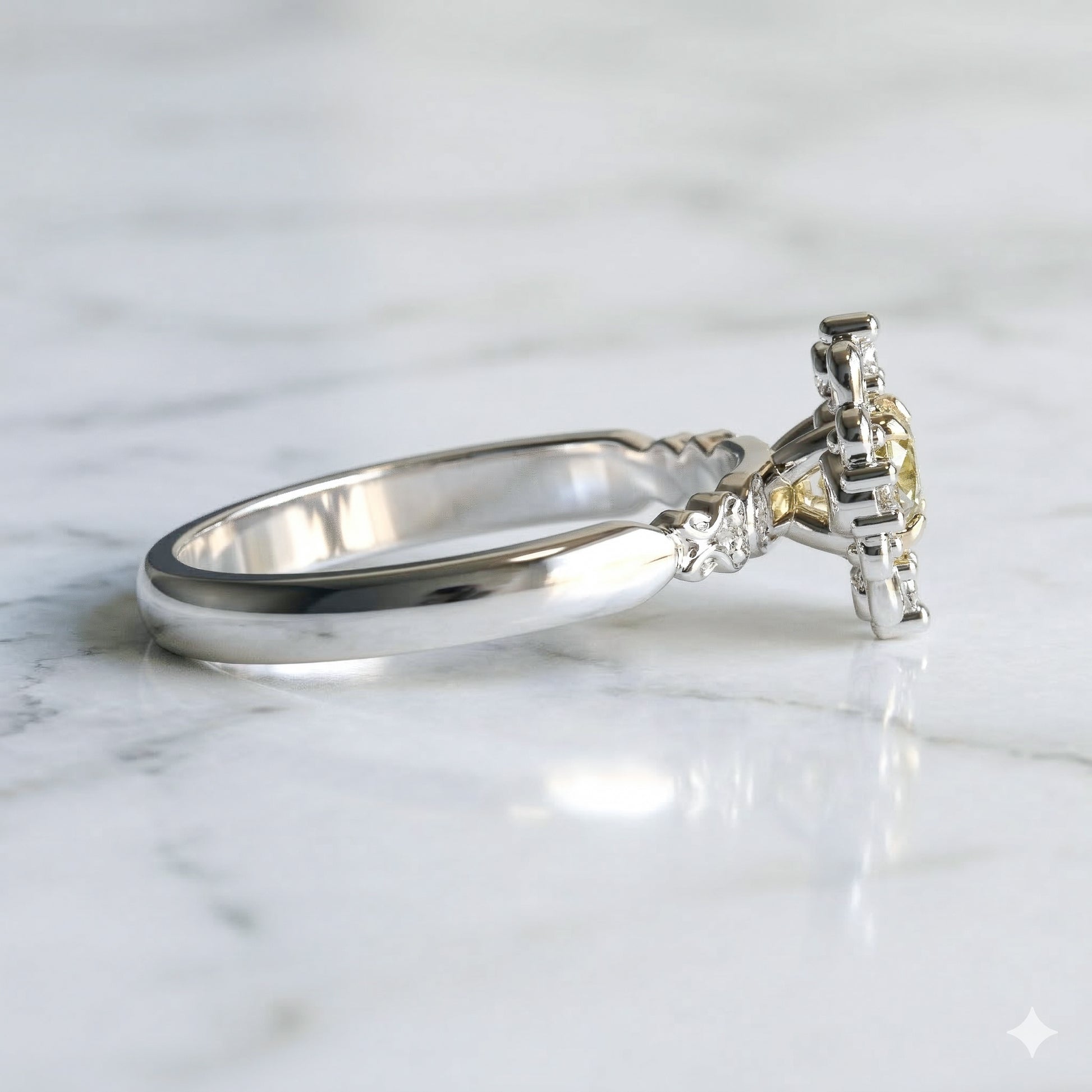 In this feminine and detailed, antique inspired engagement ring, a lab grown light yellow sapphire is surrounded by a halo of four small lab grown diamonds and curvy gold filigree details. The details also appear on the underside of the setting and on the shank.