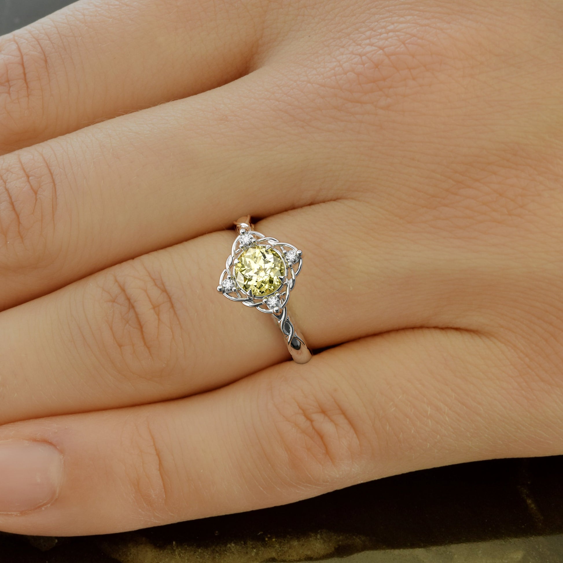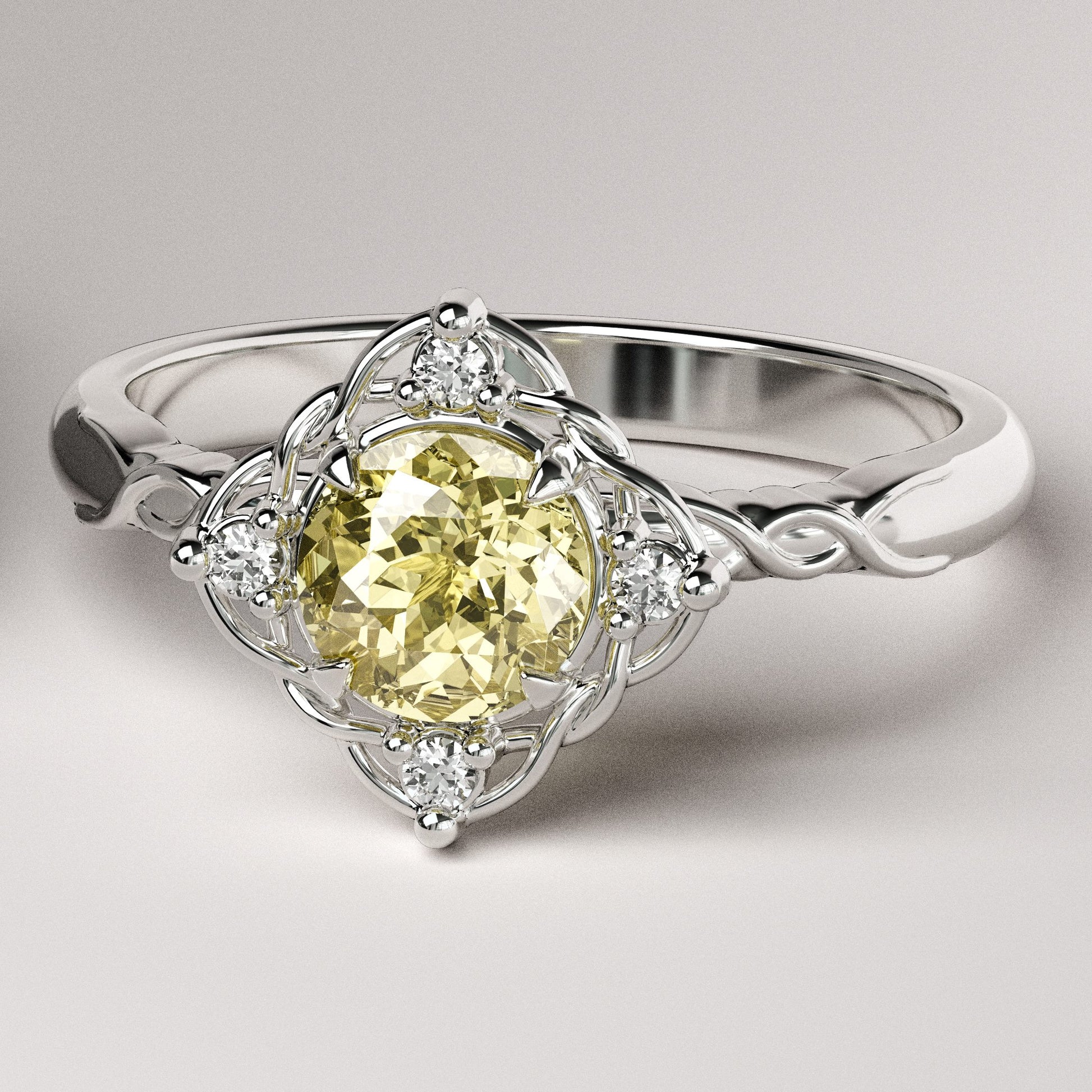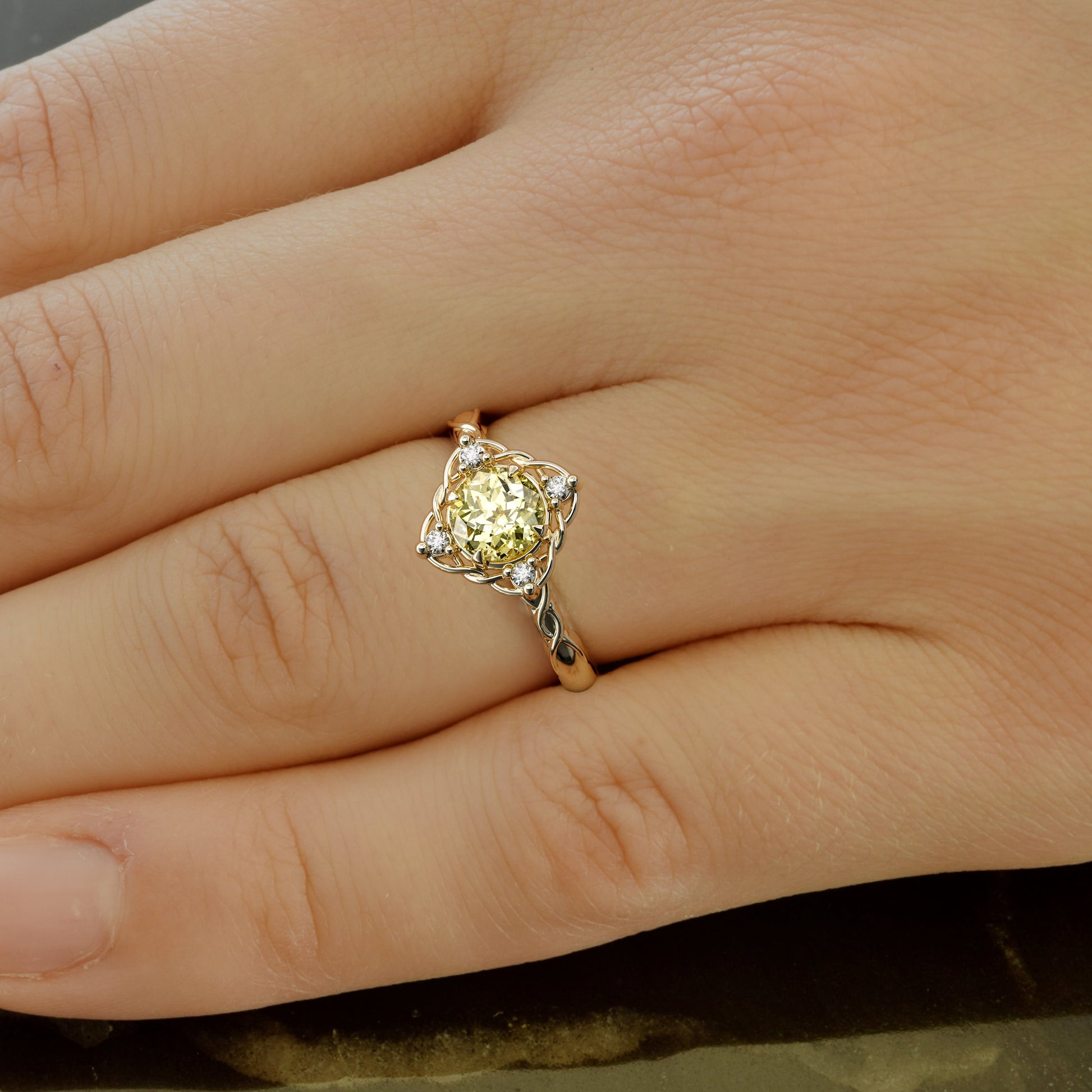 Light yellow sapphire unique halo engagement ring featuring 4 small lab grown diamonds and woven gold strands surrounding a 6mm round Chatham lab created light yellow sapphire gemstone.